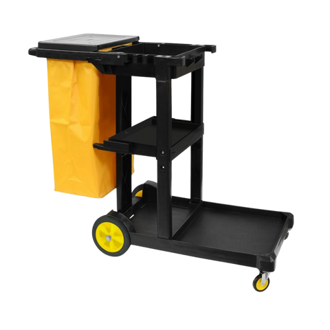 High impact plastic frame with folding lid to cover the trash bag 8" rear wheels, 3" front casters - Non-Marking Adjustable center shelf and multiple hooks for tool storage Includes...